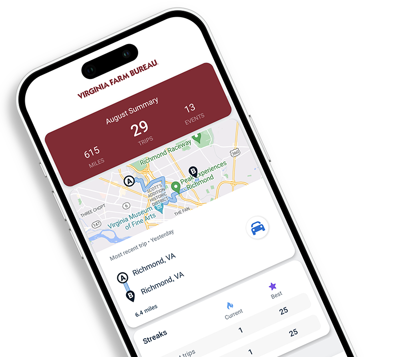 ** Safe driving discount at renewal is based on safe driving score. Coverage provided by Virginia Farm Bureau Mutual Insurance Company® and affiliates. For informational purposes only. Does not replace or modify your existing policy’s provisions, exclusions and endorsements.